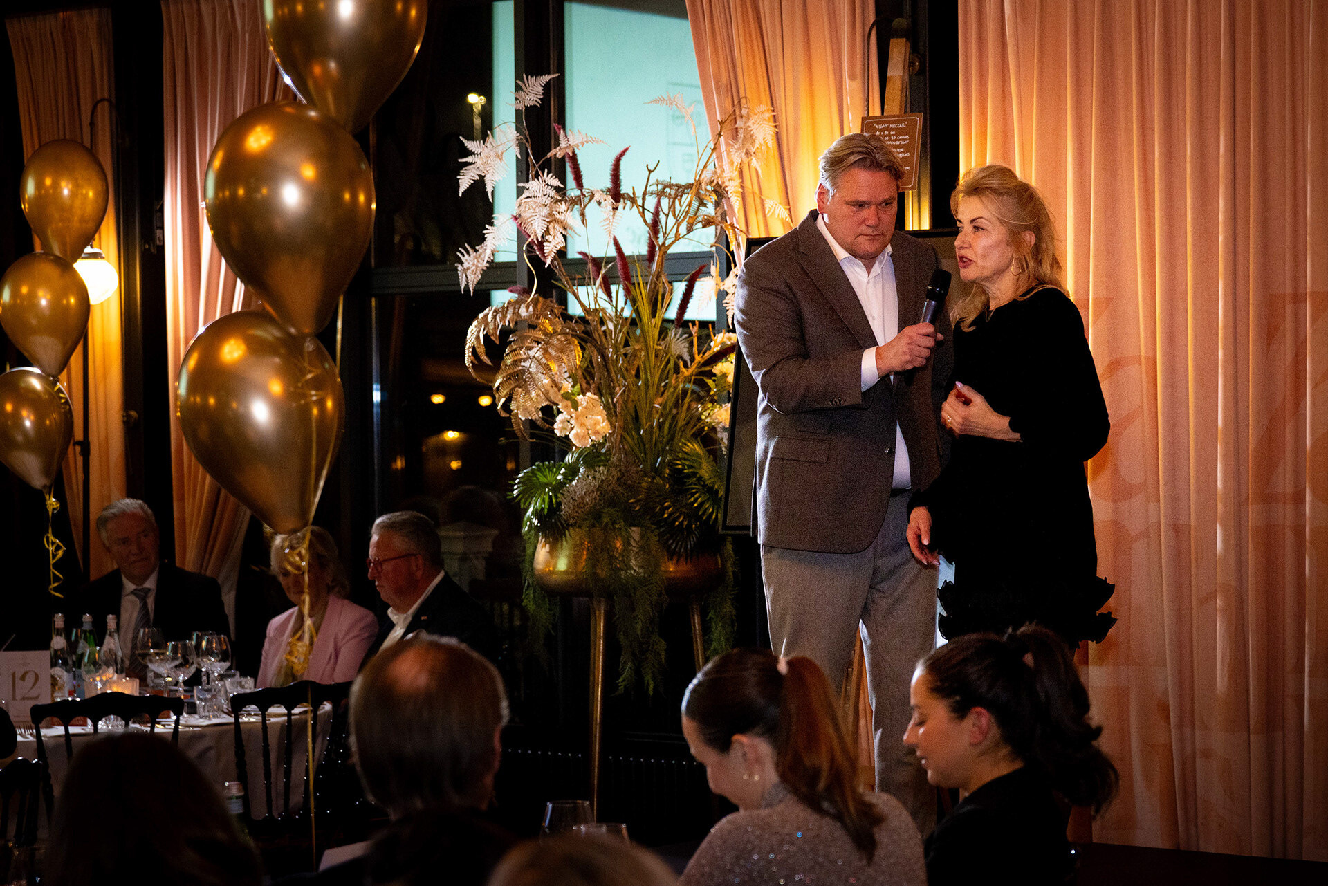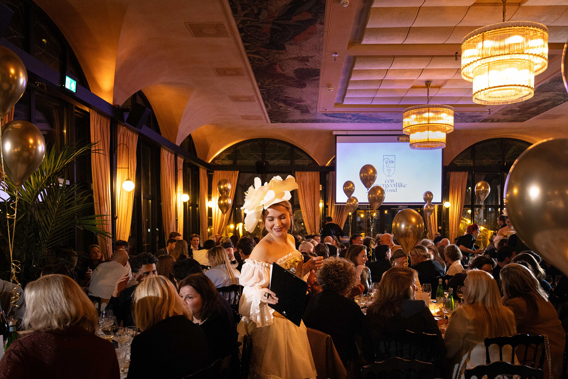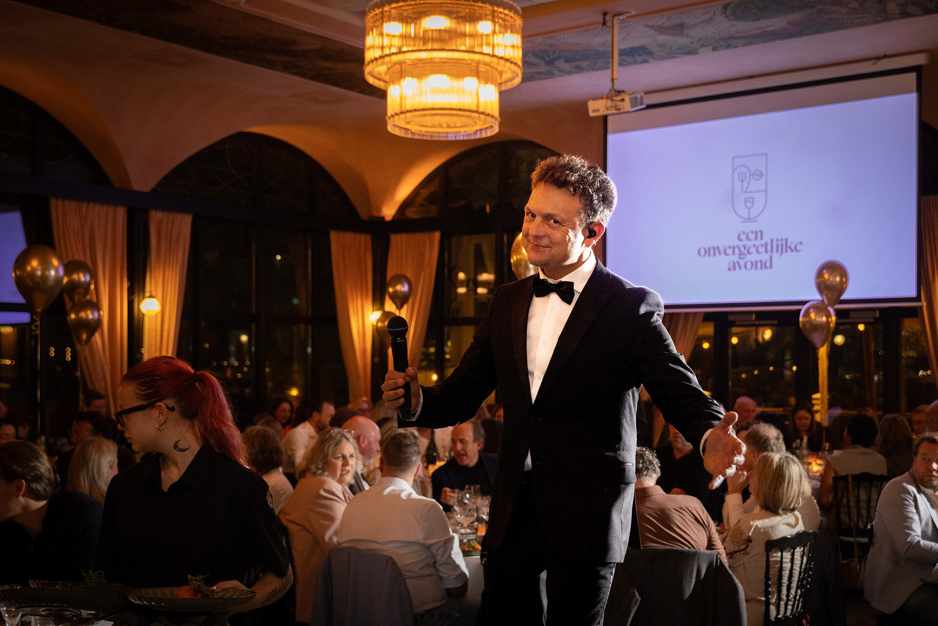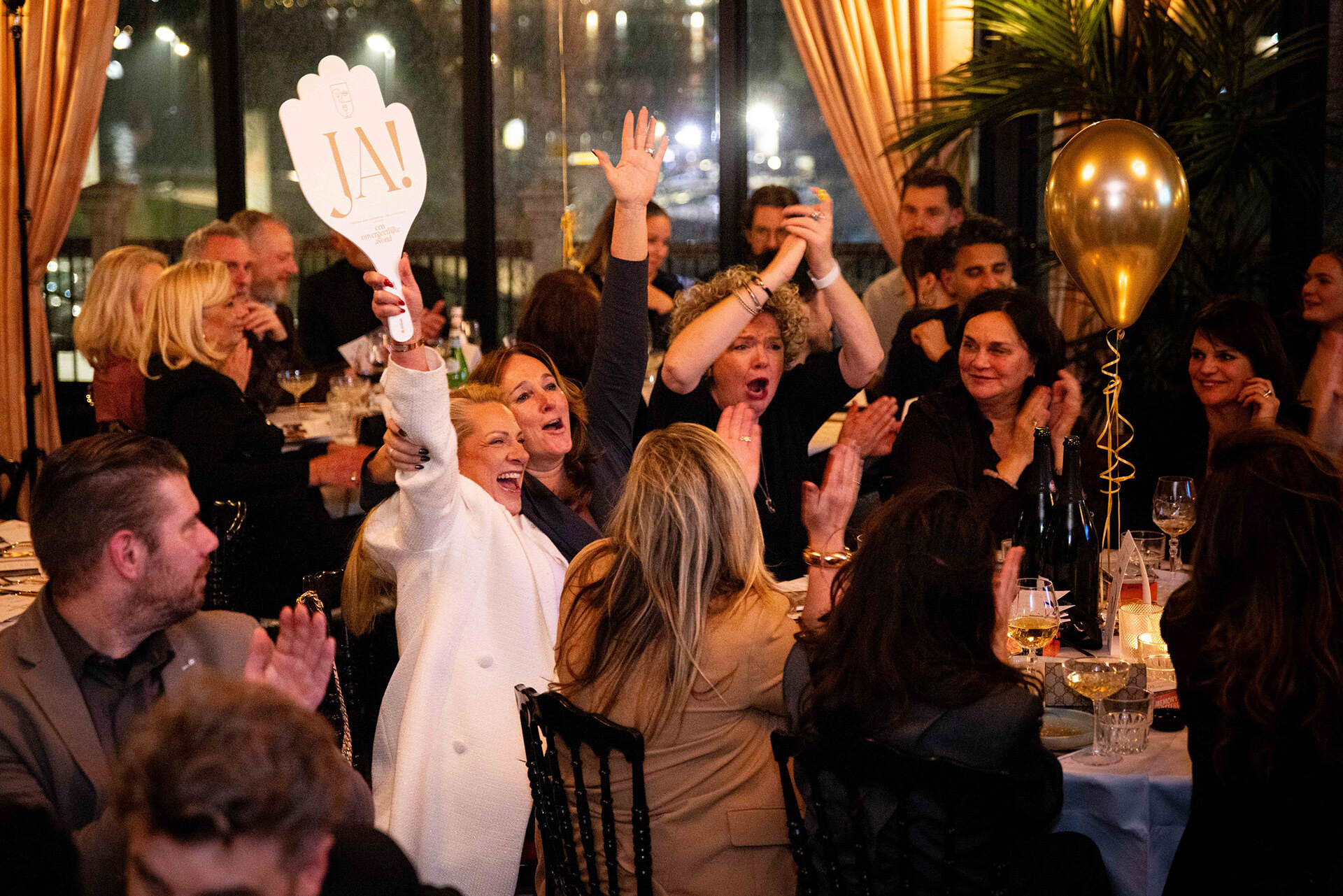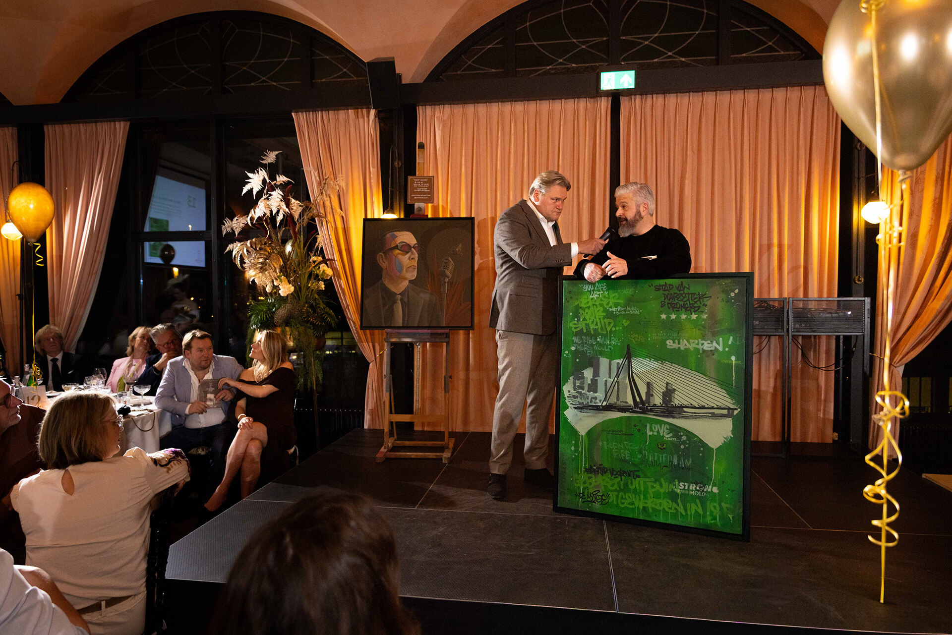 Ondernemende Rotterdammers, partners en andere betrokkenen genoten van een verzorgd driegangendiner, boden enthousiast mee op bijzondere veilingitems, namen deel aan de loterij en lieten zich meevoeren door het energieke optreden van zanger Johnny Rosenberg en als klap op de vuurpijl het waanzinnige spektakel van De Wannebiezz.