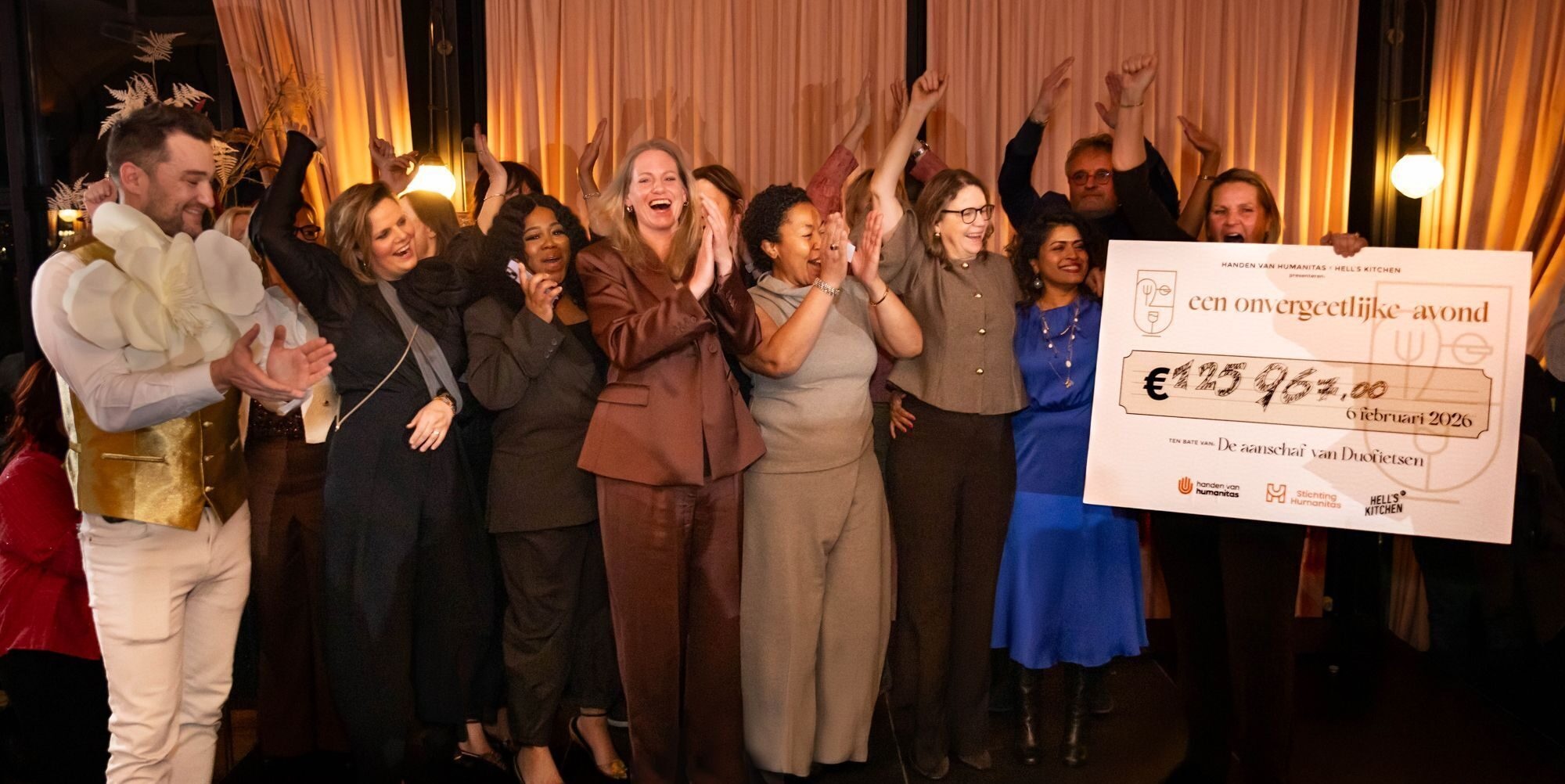Afgelopen vrijdag 6 februari organiseerde vriendenstichting Handen van Humanitas samen met Hell's Kitchen van Herman Hell het benefietdiner ‘Een onvergEETelijke Avond’ in het Zalmhuis Rotterdam. Een avond met maar één doel: geld inzamelen voor duofietsen voor mensen die leven met dementie. Beweging en ontspanning zijn essentieel om het verloop van dementie te vertragen en dankzij de enorme betrokkenheid van onze gasten werd er impact gemaakt! Dankzij alle aanwezigen is een prachtig bedrag opgehaald van €125.967 dat direct bijdraagt aan de aanschaf van duofietsen voor de verpleeghuizen van Stichting Humanitas.